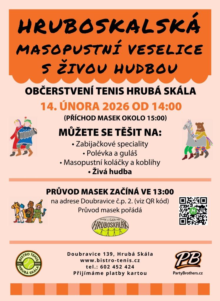 V sobotu 14.02.2026 se koná Hruboskalská masopustní veselice s bohatým programem. Návštěvníci se mohou těšit na zabijačkové speciality, polévku a guláš, masopustní koláčky a koblihy. K příjemné atmosféře přispěje živá hudba. Příchod průvodu masek je očekáván kolem 15:00. Všichni jsou srdečně zváni.