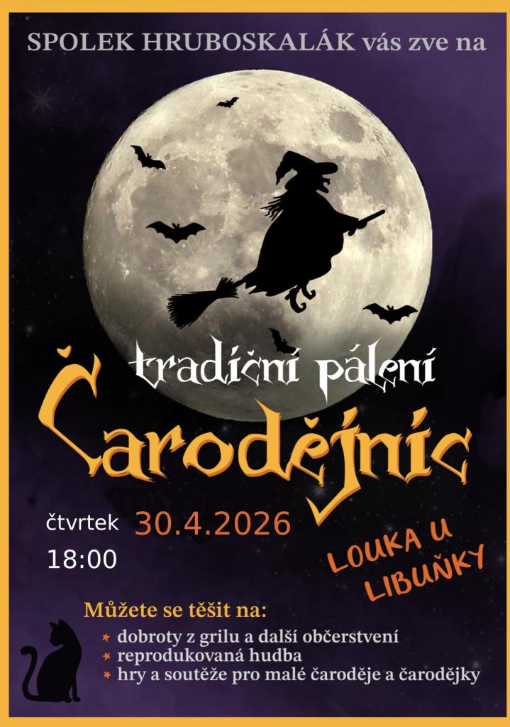 Spolek Hruboskalák vás srdečně zve na tradiční pálení Čarodějnic, které se koná ve čtvrtek 30. dubna 2026 na louce u Libuňky. Těšit se můžete na dobroty z grilu a další občerstvení. Pro malé čaroděje a čarodějky budou připraveny hry a soutěže, které zpestří program. Akce bude doplněna reprodukovanou hudbou pro příjemnou atmosféru.