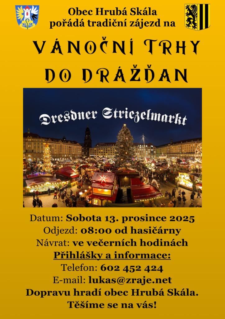 Zveme vás na zájezd na Vánoční trhy do Drážďan, který se uskuteční v sobotu 13. prosince 2025. Odjezd je naplánován na 08:00 od hasičárny v Doubravicích. Návrat proběhne ve večerních hodinách. Pro přihlášení využijte telefonní číslo 602 452 424 nebo e-mail lukas@zraje.net. Těšíme se na vaši účast a věříme, že si společně užijeme krásnou atmosféru vánočních trhů.